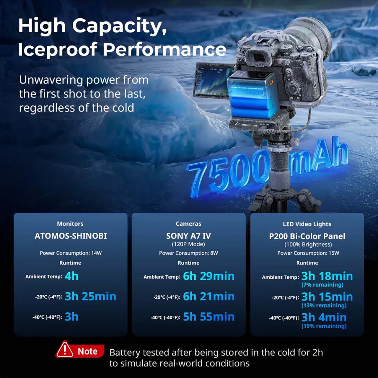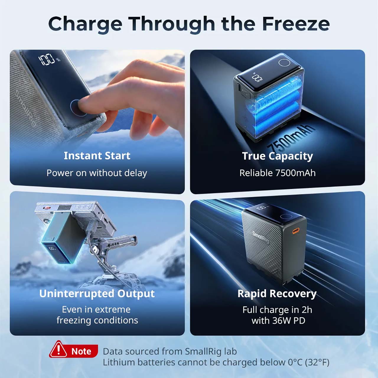 傳統鋰電池在低溫環境下,內部的化學反應會變得遲緩,導致電壓下降、蓄電量大幅縮減。SmallRig 這次推出的「極致耐寒版」電池,採用特殊的電芯技術與優化的電路管理系統,讓電池無需外部加熱裝置,就算在攝氏零下 40 度的極寒環境,依然能維持穩定的放電效率。