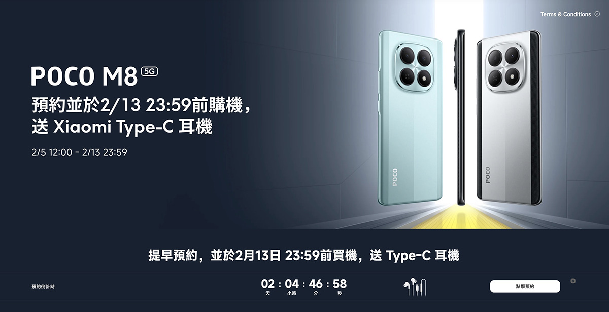 據小米香港官網 POCO M8 5G 預售頁面資訊,現時裝置已開放預售,在 2 月 13 日或之前成功出機,將加送 Type-C 耳機,及享新人優惠、舊換新補貼等著數。