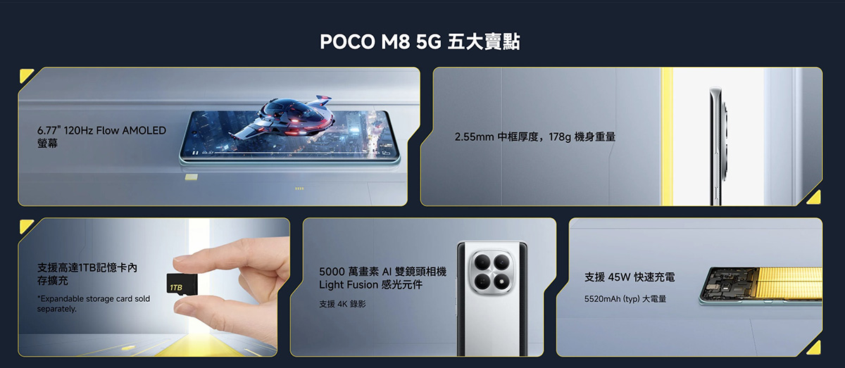 POCO M8 5G 採用高通 6G3 晶片、8+256/8+512 配置可外接 MicroSD 記憶卡,5,520mAh 電池支援 45W 快充,Dolby Atmos 雙揚聲器、並具 NFC 跟螢幕指紋。