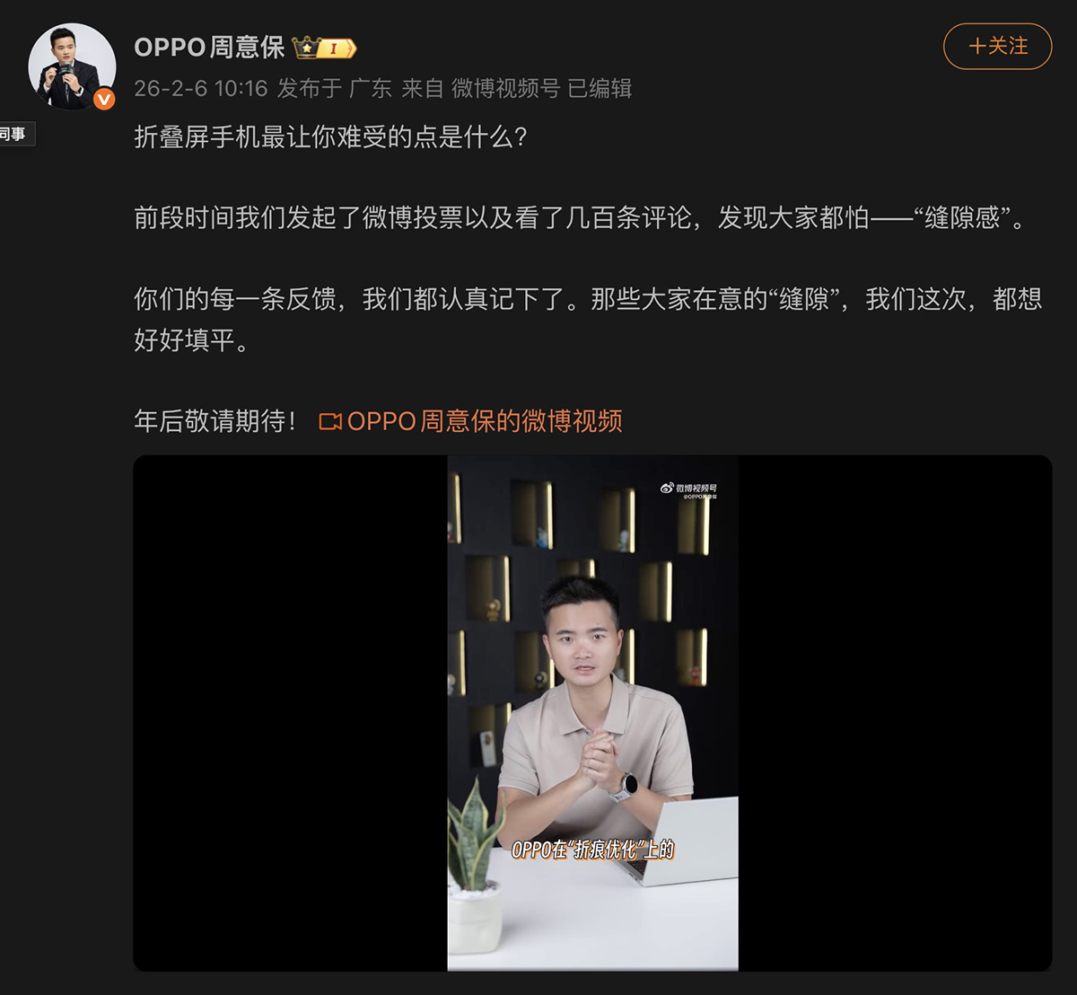 OPPO Find 系列產品負責人周意保早前經微博發表短視頻,為 OPPO Find N6 進行先行預熱,提到用家出機最顧慮要素,仍然為主屏開展時摺痕現象。
