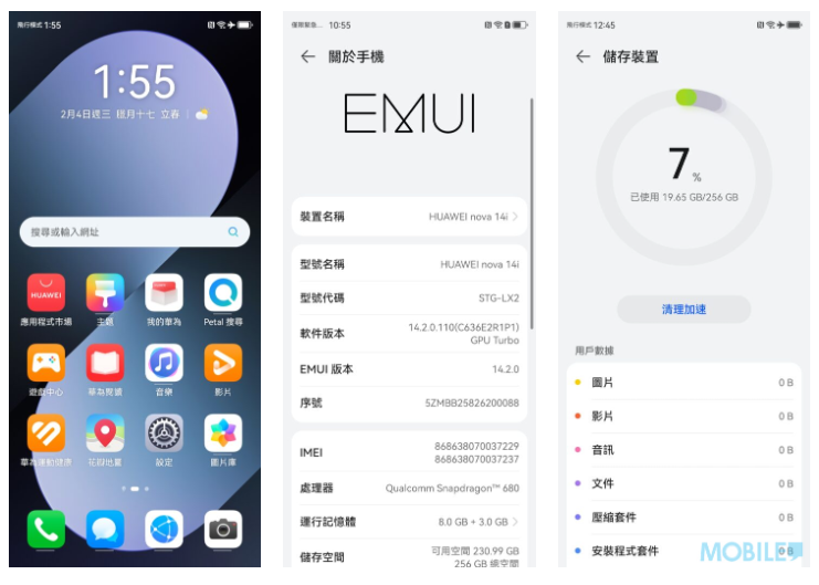 軟體方面運行基於 EMUI 14.2 的系統,介面操作流暢且支援多種智慧功能。用家可以透過華為內建的 AppGallery 或 Petal Search 輕鬆安裝 WhatsApp、Instagram 及各類常用程式,而且可安裝”microG”後,可完整使用 Google 服務。系統中的 Live View 與 SuperHub 功能也為跨設備連接提供了便利,與華為自家的筆電或耳機能夠實現無縫協作。