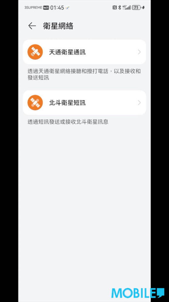 使用港版 Mate X7 進行衛星通訊方法簡單,打開設定頁面點擊「衛星網絡」,進入分頁後可看到裝置同時支援北斗及天通衛星通訊;