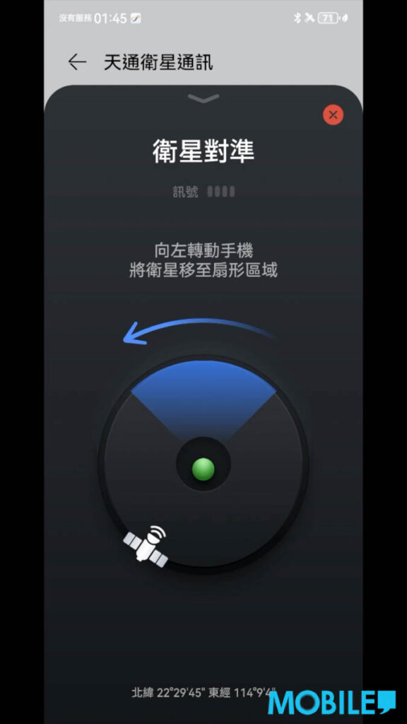 啟動後會顯示衛星對準介面,用家需按指示轉動手機以進行校準
