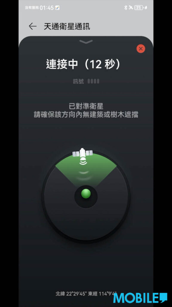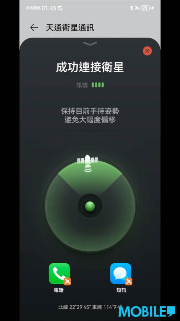 這次試用衛星通訊服務採用天通網絡,啟動後會顯示衛星對準介面,用家需按指示轉動手機以進行校準;校準衛星後將顯示連接頁面,一般而言數秒就能完成連接。