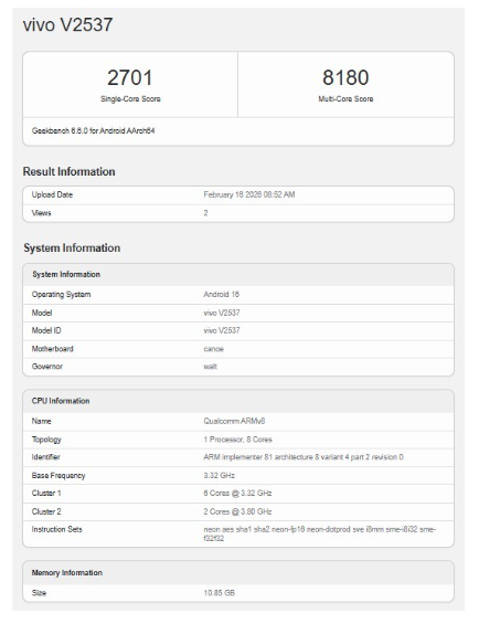 據 Geekbench 6 的跑分紀錄,vivo X300 FE 的單核得分與多核得分均展現出強勁的效能表現。最受關注的處理器部分,資料顯示該機配備了一顆代號為 MT6991 的晶片,這正是聯發科最新的旗艦級行動平台天璣 9400。這顆處理器採用台積電第二代 3nm 製程技術,具備全大核架構設計,預期在處理高負載任務與日常運作時,能提供更佳的能源效率與流暢度。