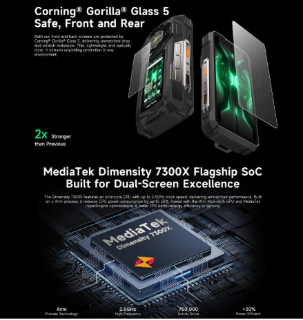 Armor 33Pro 5G 最受矚目之處在於內置 25,500mAh 海量電池,電量儲備約為一般智能手機的五倍,足以支撐數天的連續高強度作業。為了應對龐大電量,機身支援 66W 快充技術,有效縮短補給時間。效能方面,新機採用 MediaTek Dimensity 7300X 5G 處理器,這顆 4nm 製程芯片在提供流暢 5G 連接的同時,兼顧了優異的能耗比。