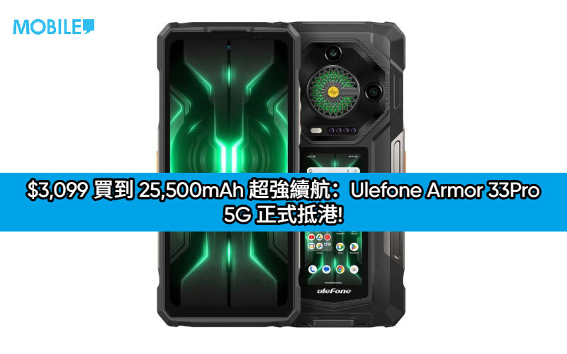 【MOBILE】Ulefone 近日正式在香港推出全新三防手機 Armor 33Pro 5G,16GB RAM 配搭 512GB ROM 版本建議零售價為 $3,099。這款新機以驚人的電池容量為核心,結合 5G 效能與硬朗防護,為本港三防手機市場帶來新選擇。