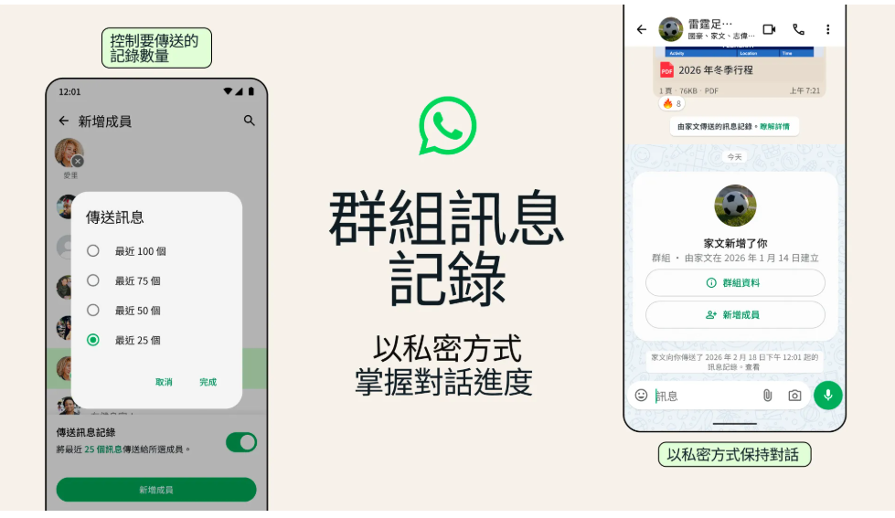 據了解,這項新功能將允許群組管理員或現有成員,在加入新成員時選擇分享最近的訊息紀錄。當用戶被加入群組時,系統會彈出提示視窗,詢問是否與新成員分享過往對話。屆時用家可以選擇分享 25 至 100 則最近的訊息,內容將完整保留發送者資訊及時間戳,並繼續沿用點對點加密技術,確保訊息傳送的安全性。
