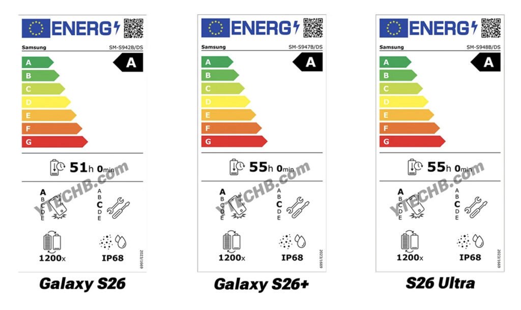 較早前有外媒展示疑似 Galaxy S26 系列歐盟能源效益標籤資訊,三機(S26、S26+ 跟 S26 Ultra)均獲 A 級能源認證、跟 A 級耐摔表現;另外三機亦同具 IP68 標準。