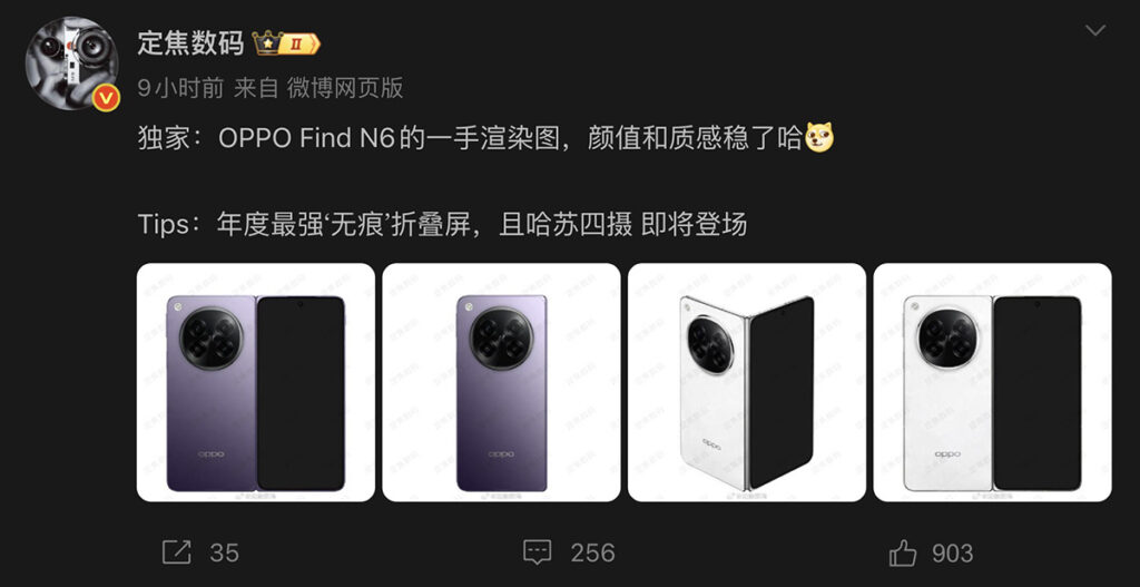 數碼博主「定焦數碼」則率先展示疑似 Find N6 渲染圖,可看到裝置具備紫及白色款選擇,外觀比例與前代 Find N5 頗為接近。