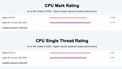以單核 CPU 的 PassMark CPU Mark 表現,A18 Pro 有 4091,而 M1 只有 1282,A18 Pro 比 M1 快上 10%。只是 M1 有 8 個核心,而 A18 Pro 只有 6 個,因此以整體效能上,A18 Pro 會不及 Apple 的初代 M1 MacBook Air,但已足夠日常基本應用,例如上網、文書和線上 AI 應用等,但不適合在此機上進行太長的影片剪輯,或者專業的圖像編輯與編程工作。