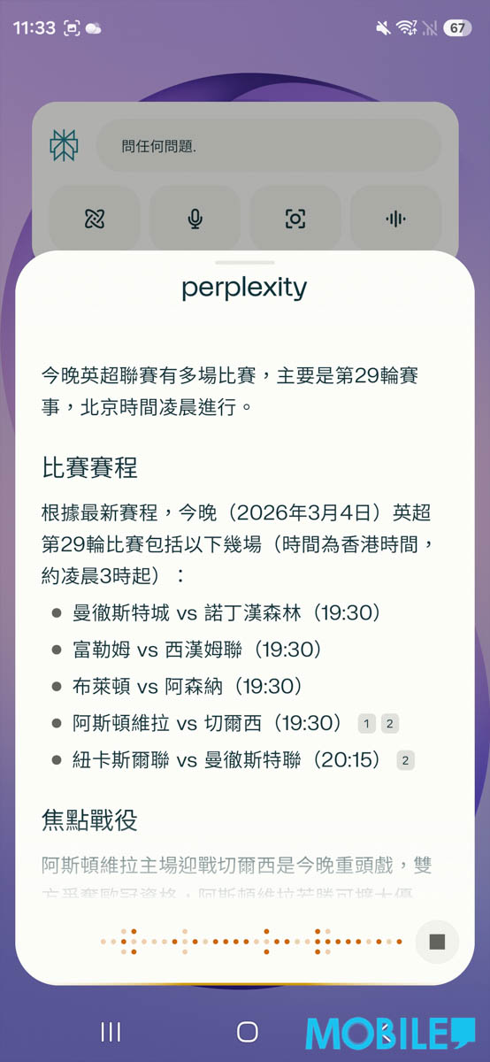 實試以 S26 Ultra 經 Hey Plex 喚出 AI 拍擋,其應答範圍非常廣,由資訊像當日天氣、球賽到交通狀況,或搜尋生活內容如網上搜圖、最新遊戲攻略等應對均可。