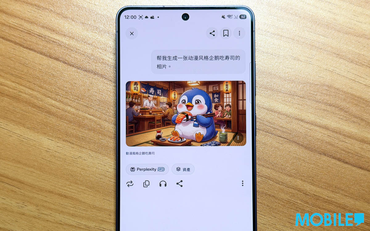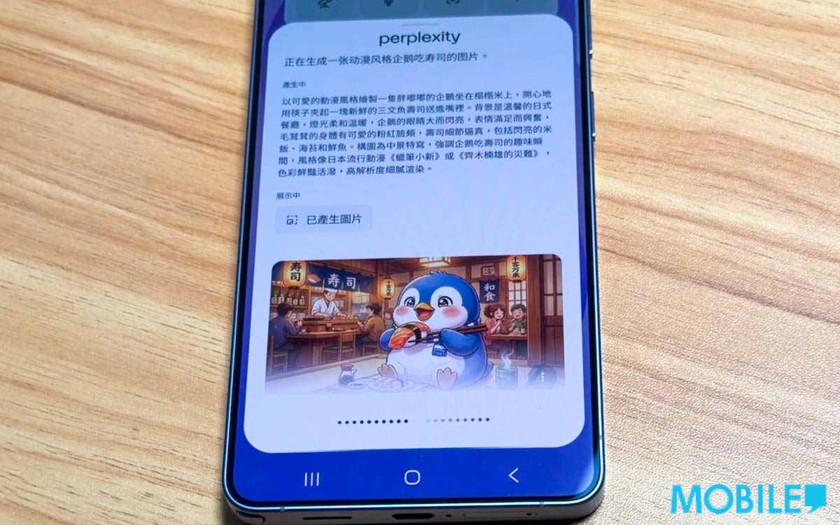 以 Hey Plex 指令喚出 Perplexity 後,以廣東話要求生成一張動漫風企鵝吃壽司相片,過程約 20 至 30 秒,可看到其以文字段落顯示、擴充 AI 圖片的思維方式。