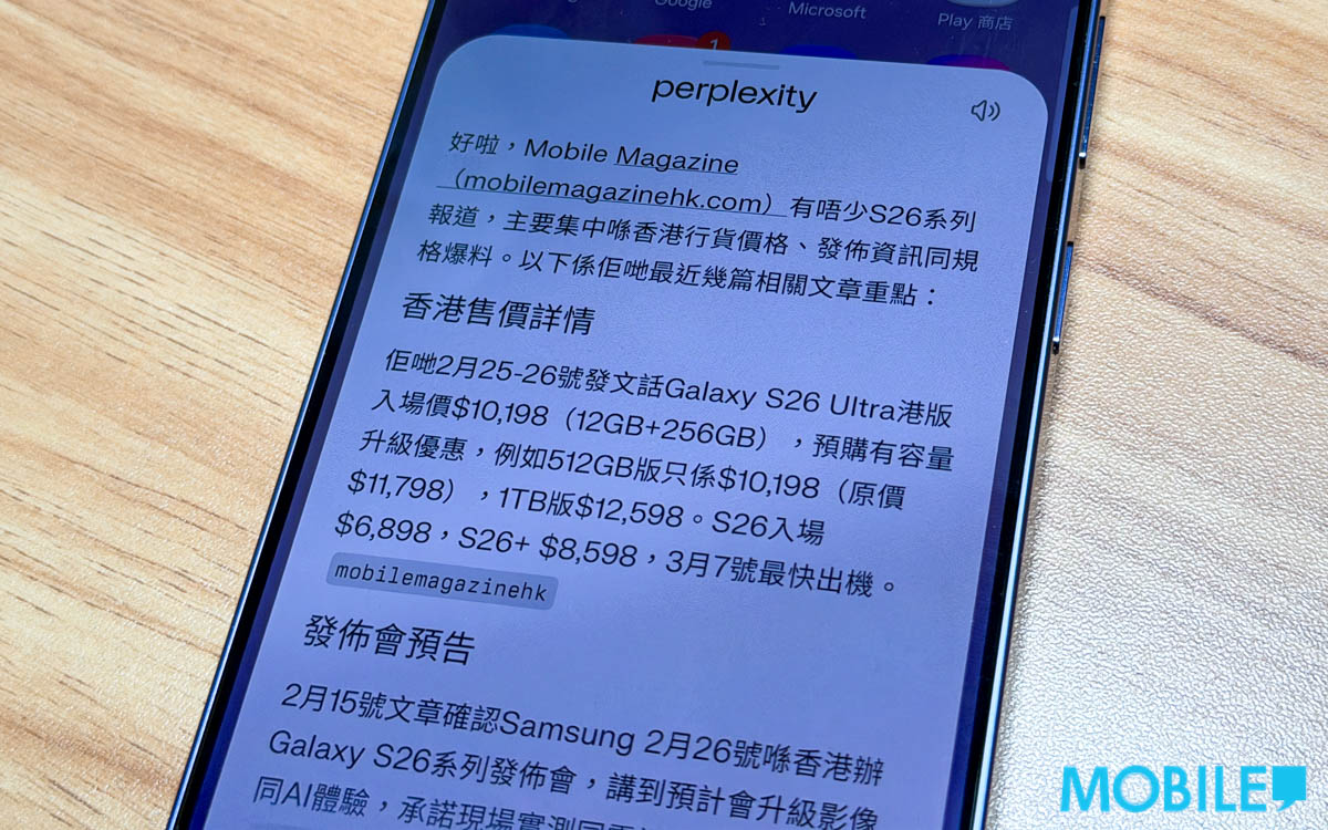 Mobile Magazine 短評:整合 Perplexity 後以「Hey Plex」喚出 AI 拍擋讓語音對話更自然直觀,讓 S26 Ultra 擁有更具廣度及深度解決問題能力,且無需額外付費。