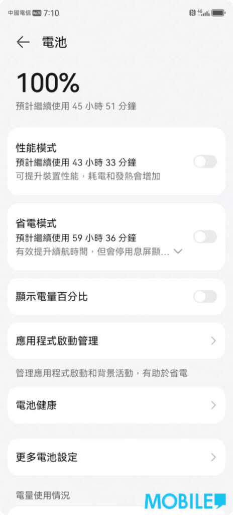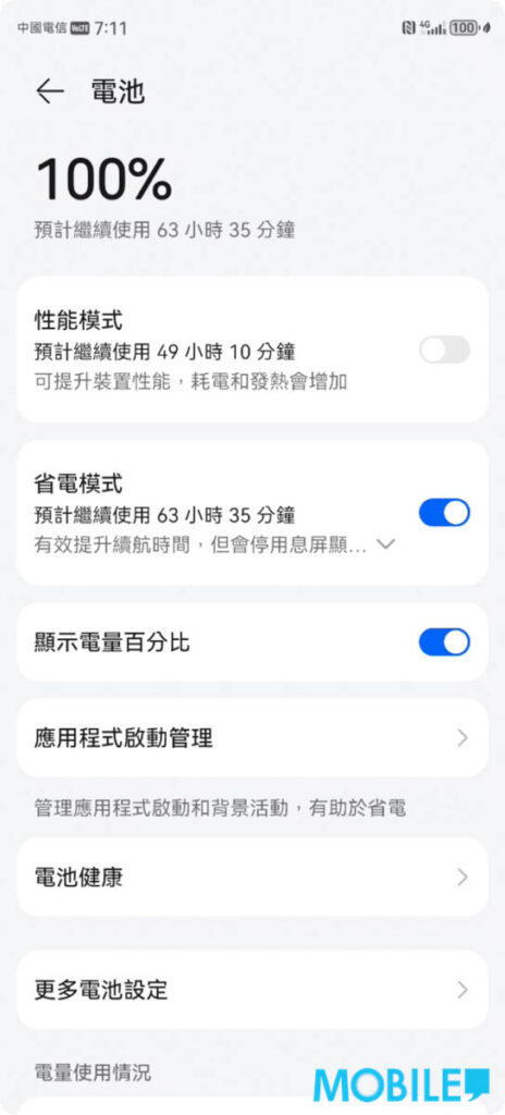 令外如日常只用手機上網、媒體瀏覽或作 IM 通訊等輕度應用,可選擇在「電池」分頁中,啟動「省電模式」以延長使用時間,以圖中為例可延長至 63 小時半以上。