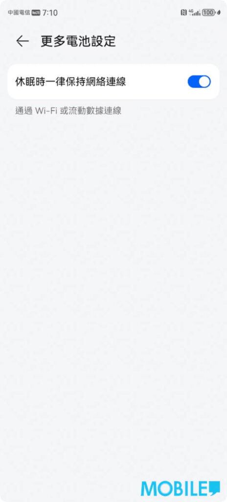 其中在「更多電池設定」選項頁中,勾選「休眠時一律保持網絡連線」,能確保手機不會錯失各個 App 如通訊軟件即時通知,建議選擇保持開啟;