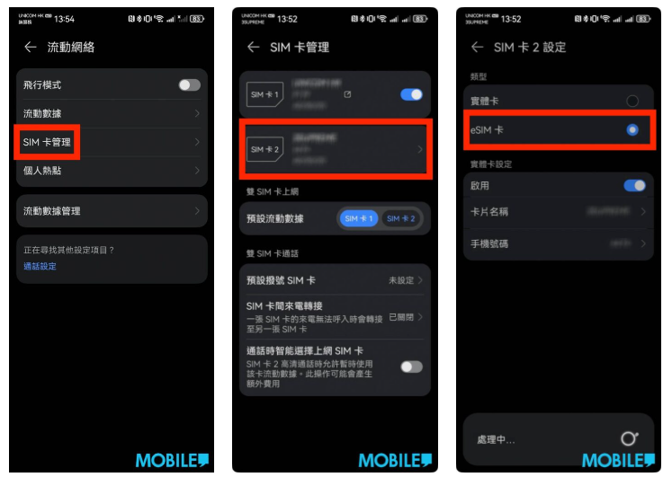 ▲ 在設定頁「流動網絡」,點擊 SIM 卡管理,進入 SIM2 設定再勾選 eSIM 卡