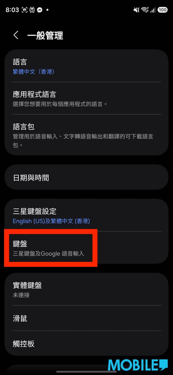 讓「滑動手勢」操作下,Galaxy S26 系列手機虛擬鍵盤移走空白部份方法簡單,在選用該模式時打開選項頁面,進入「一般管理」>「鍵盤」分頁;