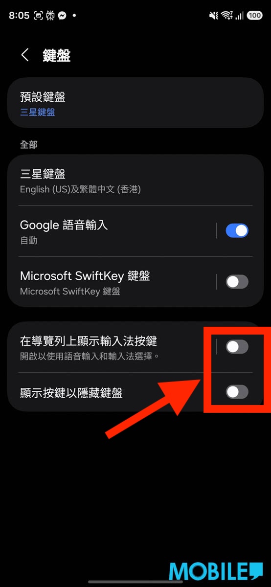 在「鍵盤」分頁中查看紅圈中兩組選項,即「在導覽列上顯示輸入法按鍵」跟「顯示按鍵以隱藏鍵盤」是否啟動,如啟動的話只需同時關閉兩組選項即可