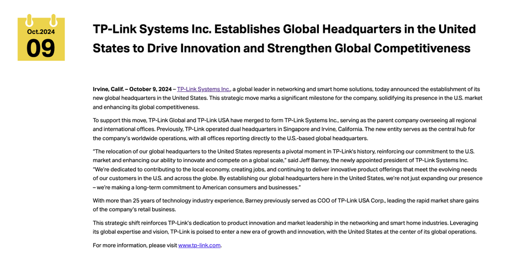 ▲TP-Link System Inc. 2024 年在美國設立總部管理美國業務。