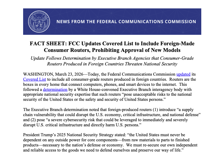 FCC 這次將外國製路由器列入禁售名單,目的在於修補長久以來的供應鏈安全漏洞。聯邦政府指出,家用路由器已成為外國勢力滲透美國家庭及小型企業的後門。
