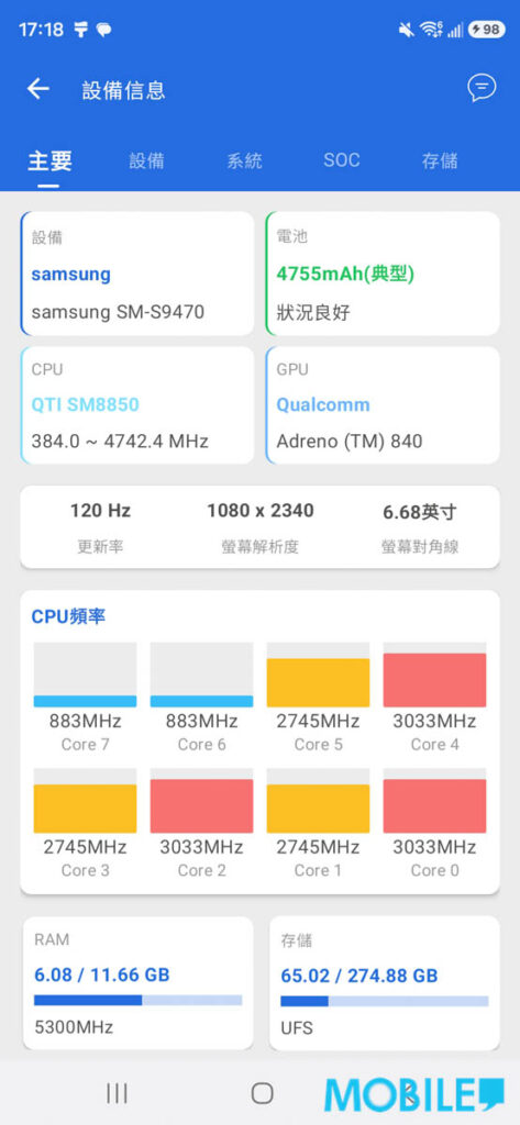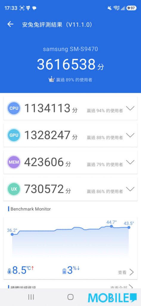 硬件部分 Galaxy S26+ 採用的 Galaxy 特供版 S8E Gen5 晶片,調整與 S26 Ultra 一樣更重效能,使其在《Antutu》、《3DMark》等測試橫向表現明顯優於前代。
