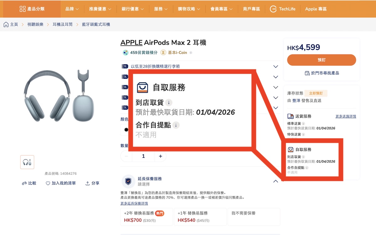 好消息是本文刊登時,有連鎖大舖上架AirPods Max 2 購買頁面,在「庫存狀態」一欄可看到,最早到店自取時間為 4 月 1 日(下週三)。