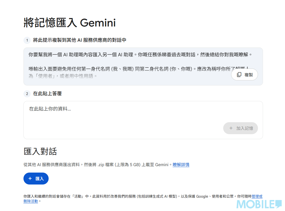 這套工具的操作邏輯非常靈活。用戶點擊 Gemini 介面中的匯入按鈕後,系統會生成一段特定的指令。用戶只需將這段指令複製並貼上到原先使用的 AI(如 ChatGPT),對方就會整理出一份包含偏好與互動規律的摘要。最後,用戶將這份回覆內容貼回 Gemini 的工具框中,Gemini 就能快速掌握用戶的背景資訊,提供更具連貫性且符合個人習慣的建議。