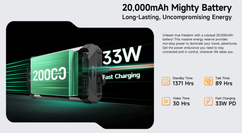 Ulefone Rugking 5 Pro 最核心的賣點無疑是那枚 20,000mAh 的超大容量電池。在一般智能手機電池普遍維持在 5,000mAh 的當下,Rugking 5 Pro 的電量相當於一般手機的四倍,待機時間更可長達 50 天以上。除了自身續航力驚人,它還支援反向充電功能,在緊急時刻能直接化身為移動電源,為隊友的設備補充電力。考慮到市面上一個具備快充功能的 20,000mAh 高品質尿袋亦需數百元,這部僅售 $1,699 的手機顯得格外抵玩。