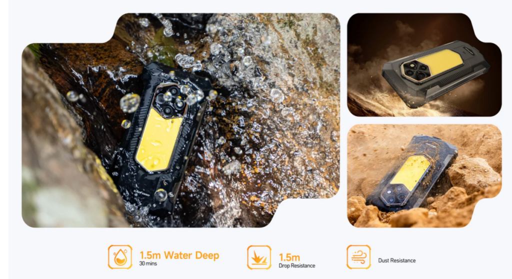 作為一部專業級三防手機,Rugking 5 Pro 的耐用度同樣出色。機身通過了 IP68/IP69K 及 MIL-STD-810H 軍規認證,能抵抗高壓水柱沖洗、灰塵侵入以及由高處跌落的衝擊。機頂位置更設有兩顆超強亮度的 LED 手電筒,光度足以覆蓋漆黑的野外路徑,對於夜間工作或戶外探險而言,這項配置比手機閃光燈實用得多。