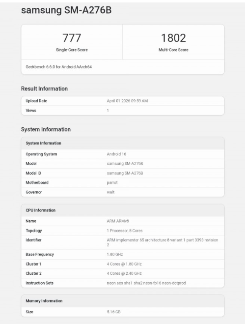 據流出的基準測試資料顯示,Galaxy A27 在單核心運算獲得 777 分,而多核心表現則來到 1,802 分。硬體規格方面,這款測試機型搭載了 Snapdragon 6 Gen 3 處理器,並配備 6GB RAM。雖然目前曝光的僅為入門版本,但預期 SAMSUNG 在正式上市時會提供更高容量的記憶體選項,以滿足不同市場的需求。