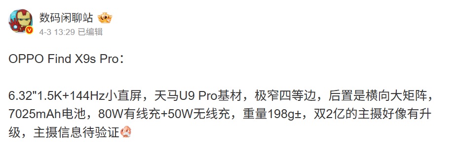 【MOBILE】隨着發佈日期逐漸接近,OPPO 旗艦系列 Find X9 系列的神秘面紗正被逐一揭開。最新消息指出,該系列將於 4 月 21 日在國內正式亮相,而備受矚目的 Ultra 型號亦會在同日進軍全球市場。爆料達人「數碼閒聊站」近期於社交平台頻頻發力,披露了 Find X9 Ultra 與 Find X9s Pro 的具體硬件細節。