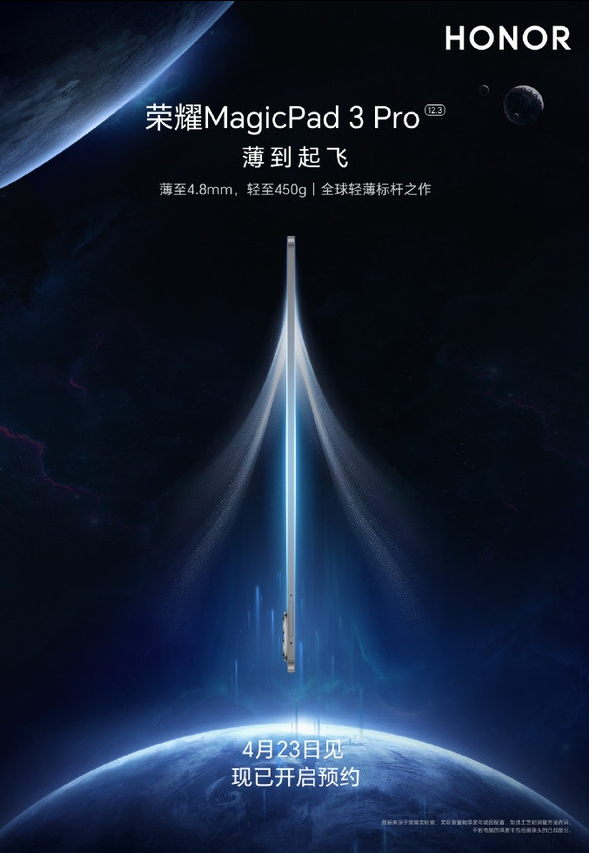 【MOBILE】HONOR 官方於近日正式宣佈,MagicPad 3 Pro 系列將迎來新成員,全新的 12.3 吋版本確定在 4 月 23 日正式亮相,目前已同步開啟預約通道。這是繼去年 10 月推出 13.3 吋性能旗艦版本後,HONOR 針對中尺寸平板市場推出的新作。