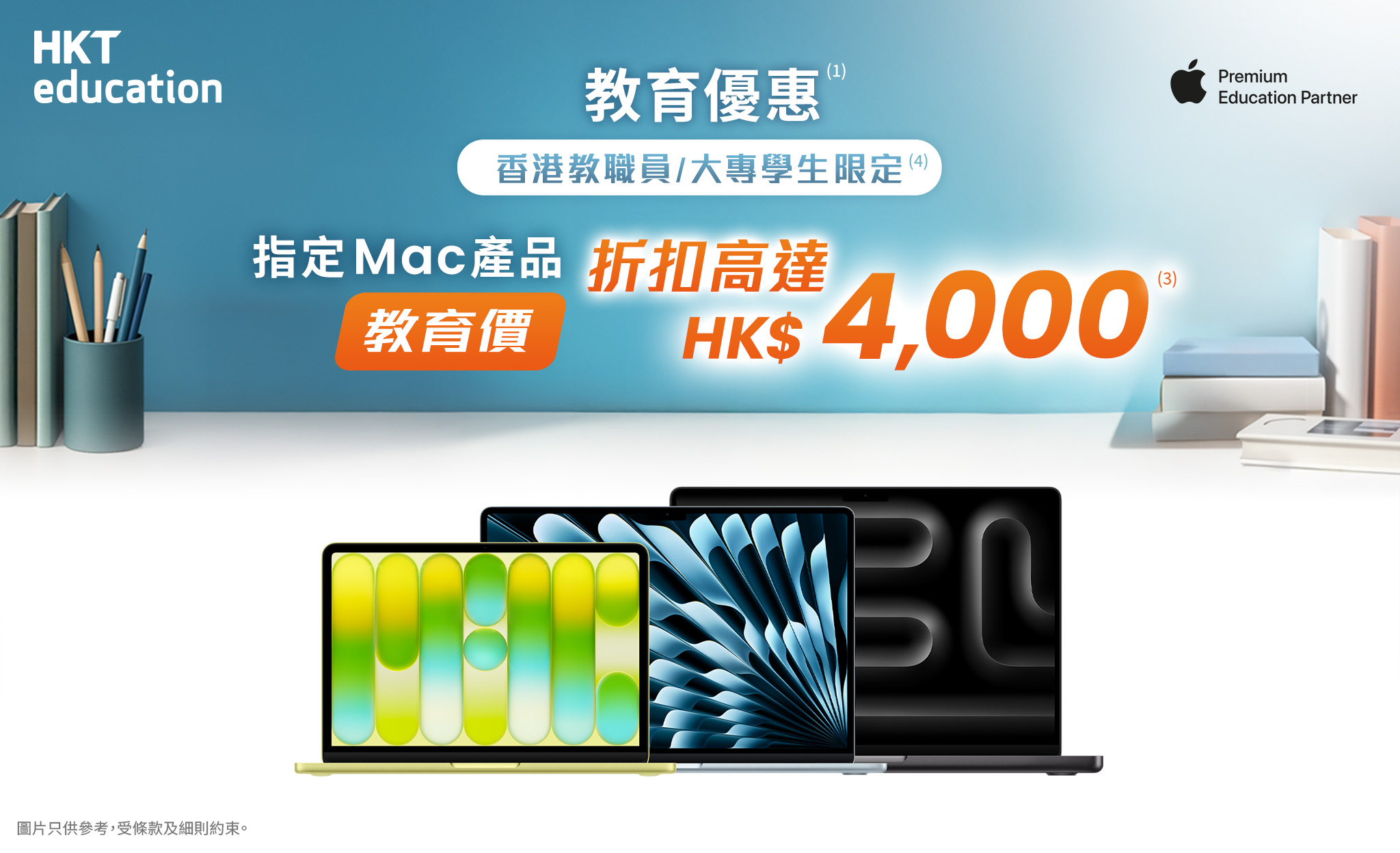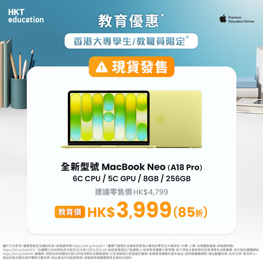 HKT education由推廣期至 2026 年 12 月 31 日,為合資格本地學生及教職員提供指定Apple產品優惠,折扣額高達港幣4,000元。當中MacBook Neo系列教育價更低至港幣3,999元起(建議零售價:港幣4,799元起),指定型號現貨已抵達csl銅鑼灣及旺角旗艦店,可即日取機。