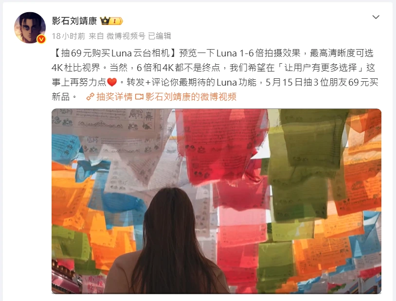 ▲Insta360 CEO 劉靖康於個人微博發布相片,正使用白色 Luna 拍攝影片。