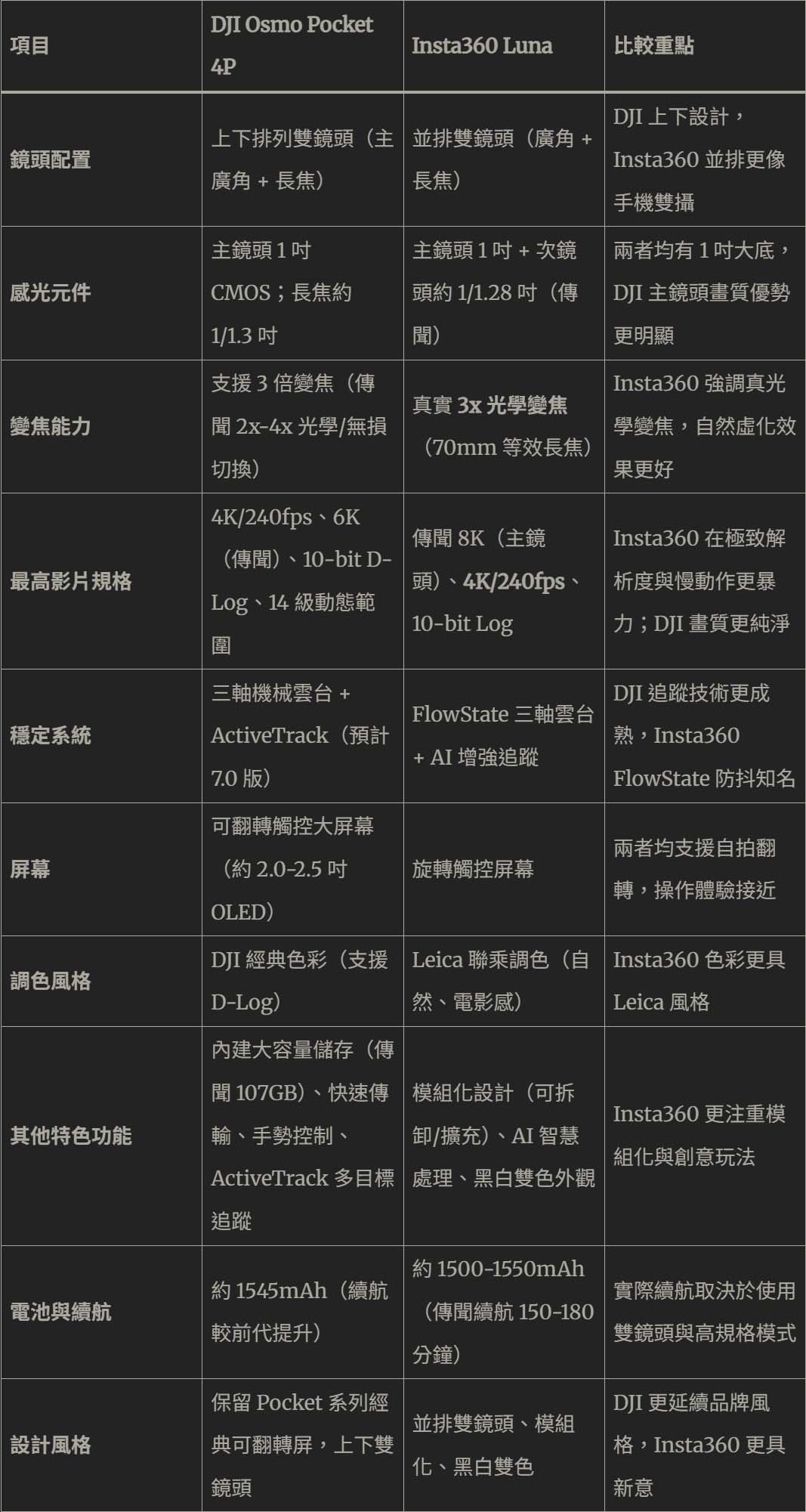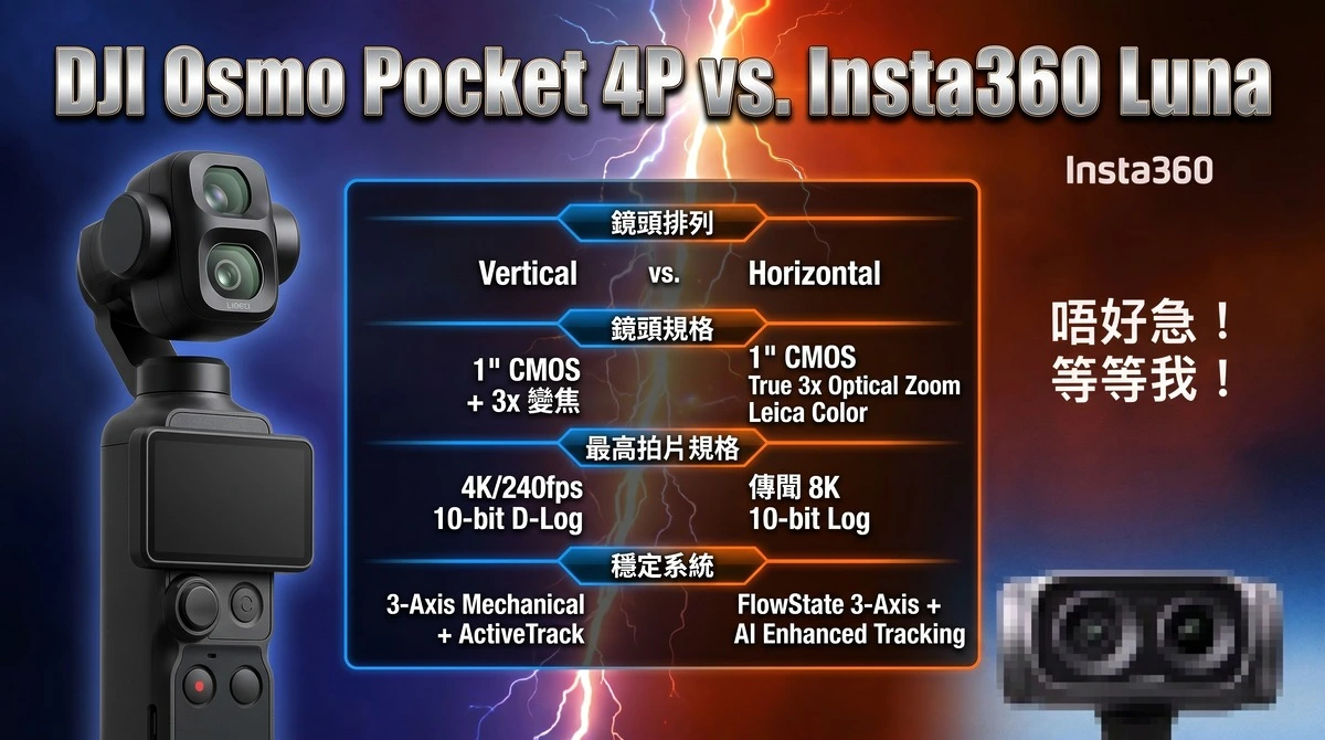 【PCM】中國 Gadget 大廠 DJI 剛剛於全球推出新一代 Osmo Pocket 4 雲台相機,大家以為真命天子已經登場?就在 Osmo Pocket 4 推出的同一日,更強的 Osmo Pocket 4P 已經於中國官網熱定身準備出場!另一邊廂,中國 Gadget 新貴 Insta360 亦即刻在香港官方 IG 預告,雙鏡頭雲台相機 Luna 以「低清」身影現身,原來雲台相機大戰而家先啱啱開始!