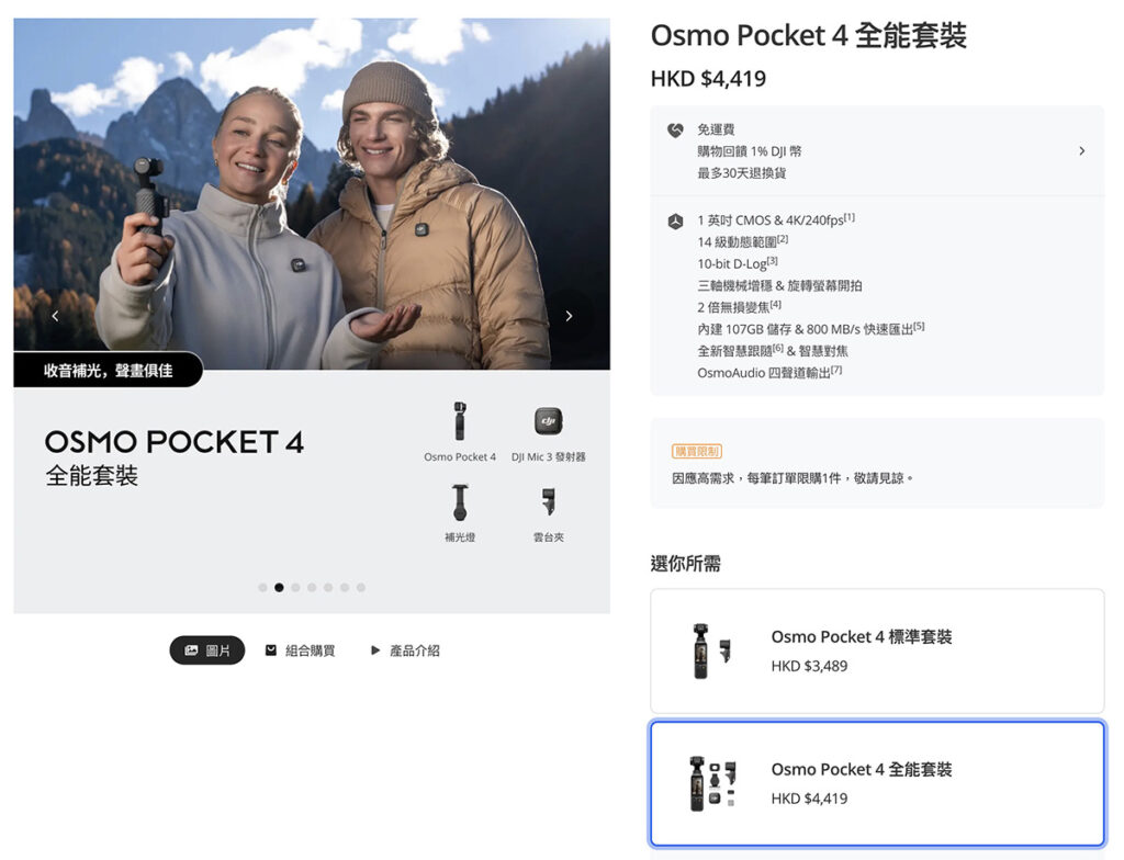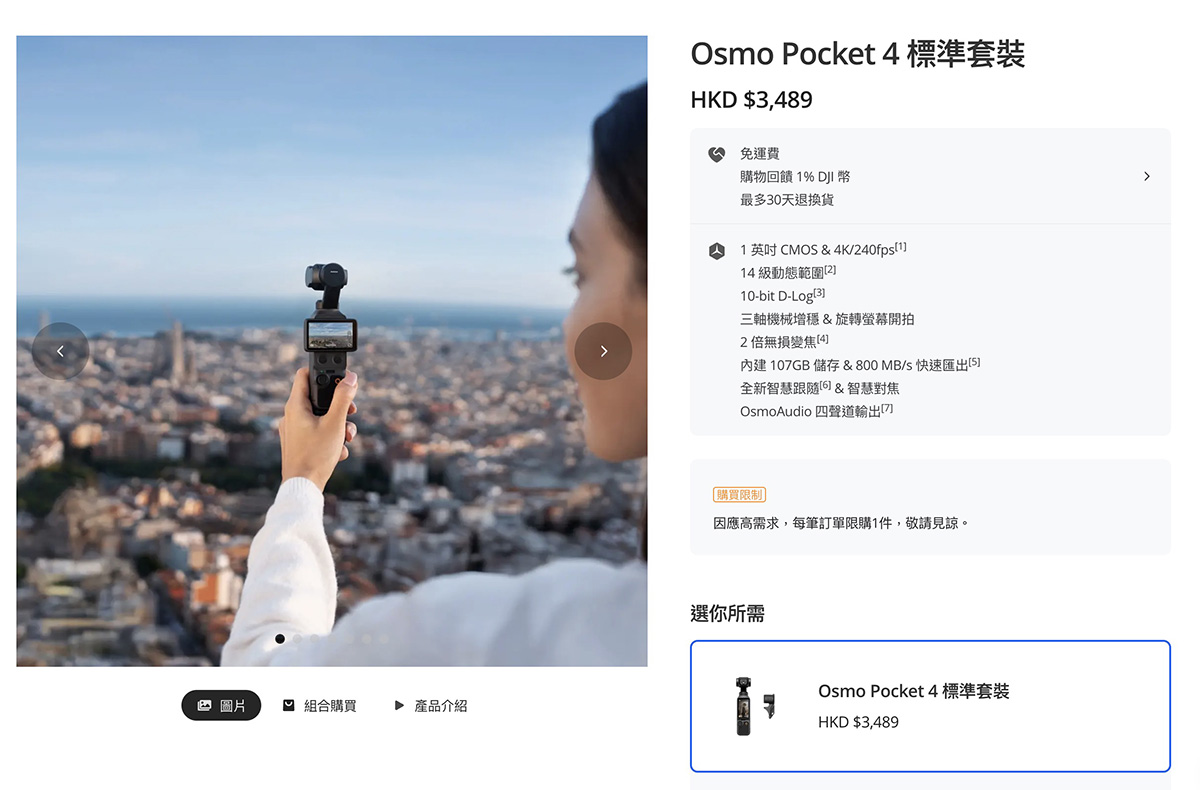 本文刊登時 DJI OSMO Pocket 4 已在品牌香港官網上架,標準套裝售價 $3,489 提供相機本體、雲台夾、螺紋手把跟便攜收納袋等配件。