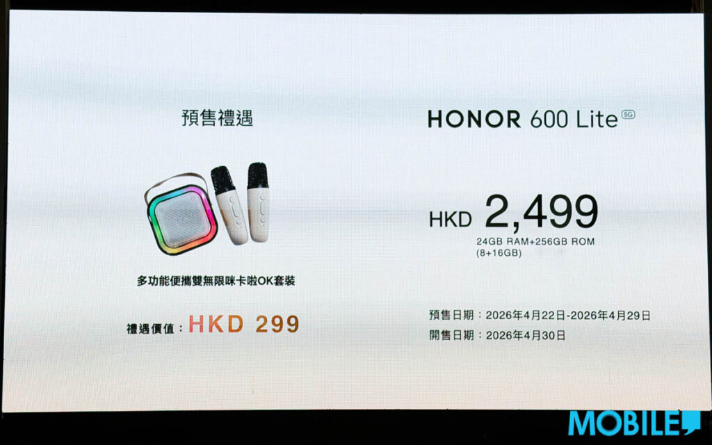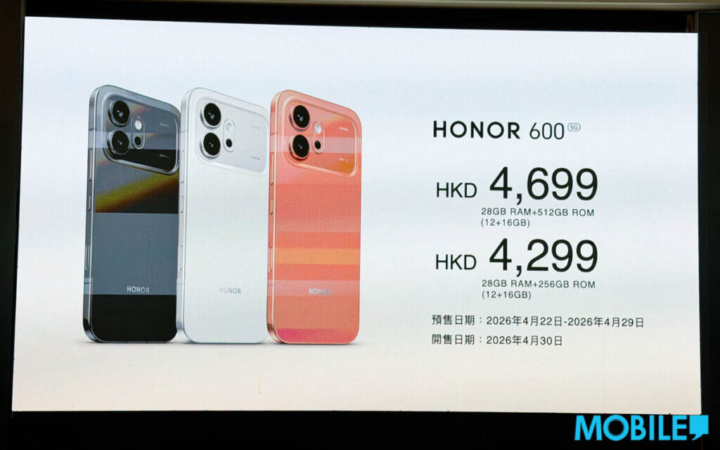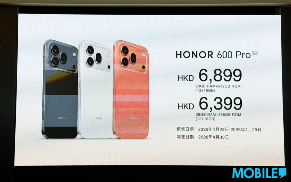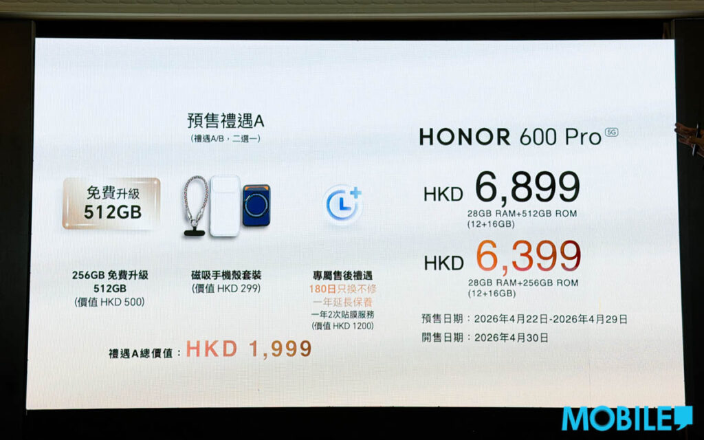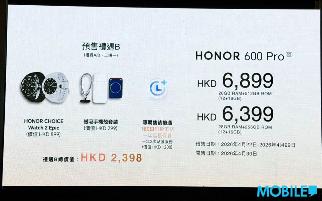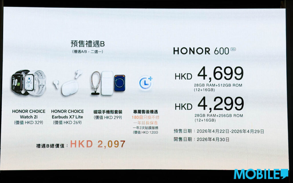 預售禮遇B(總值 $2,398)則送 HONOR CHOICE Watch 2 Epic、磁吸手機殼套裝及尊屬售後禮遇。HONOR 600 Pro 將於 4 月 30 日(下週四)正式開賣。