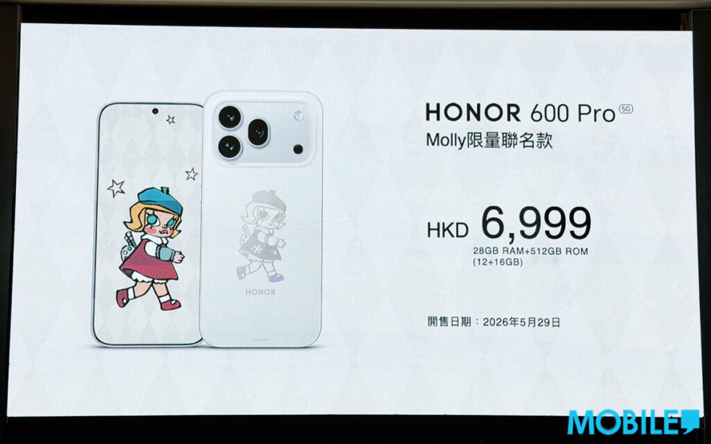 另外港版亦引入 HONOR 600 Pro Molly 限量聯名款,12+512 售 $6,999 將於 5 月 29 上市,其同具 S8E 晶片、200MP 三鏡及 7K 大電池等配置。
