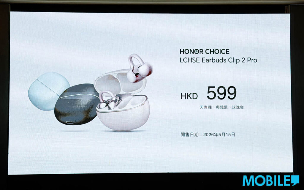 除 HONOR 600 Series 手機外,同場 HONOR 尚推出佩戴方便的 HONOR CHOICE LCHSE Earbuds Clip 2 Pro(售價 $599),港版具天青釉、典雅黑及玫瑰金三色。
