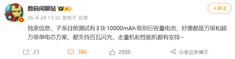 【MOBILE】據爆料達人「數碼閒聊站」於微博披露的最新消息,紅米 Redmi 研發團隊目前正同步開發三款配備 10,000mAh 超大容量電池的新機。這項技術突破預計將徹底解決消費者的電量焦慮,並為中階與效能旗艦市場帶來前所未有的續航體驗。