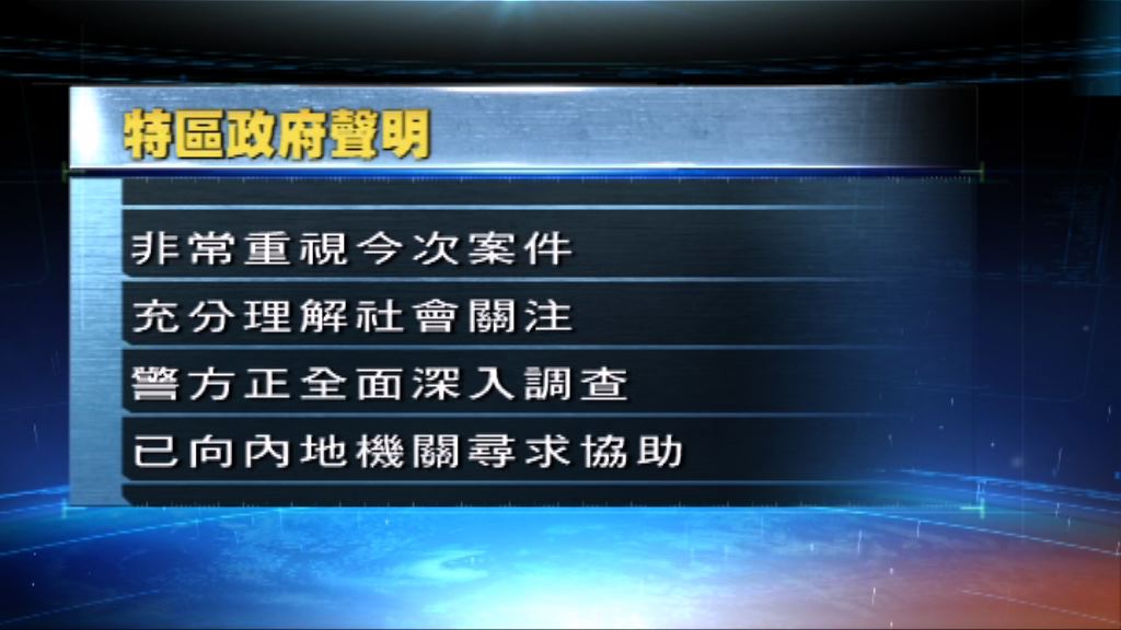 【now新聞台】政府發表聲明指非常重視今次案件,也充分理解社會對案件的關注,警方正就事件進行全面和深入的調查,並已向內地相關機關尋求協助,以及會促請早日回覆。