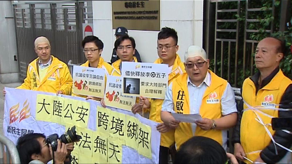 【now新聞台】大約十個新民主同盟成員遊行到中聯辦,要求內地當局釋放銅鑼灣書店5名失蹤店員及股東。