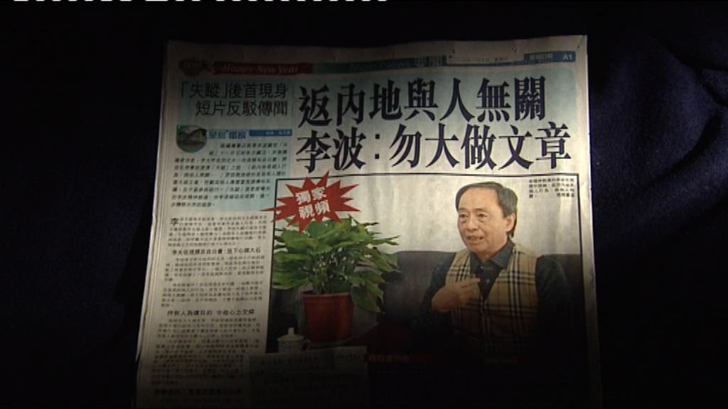 【now新聞台】銅鑼灣書店負責人李波失蹤事件,有傳媒報道李太昨日收到丈夫的影片和自白書,內容批評有人藉事件大做文章,不知道他們想得到甚麼利益,呼籲其他人不要再大做文章,亦不要參加支聯會就事件組織的抗議遊行。