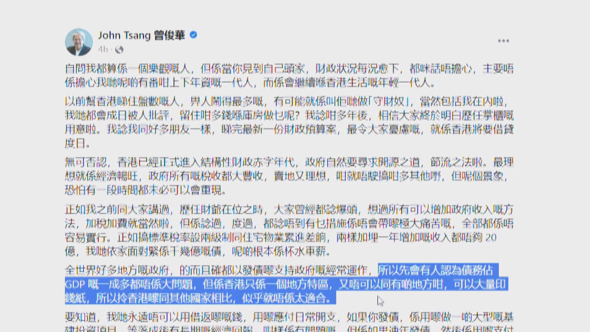 【Now新聞台】財政預算案提出發債1200億元,前財政司司長曾俊華指香港已經正式進入結構性財政赤字年代,不能長期靠發債應付政府開支。