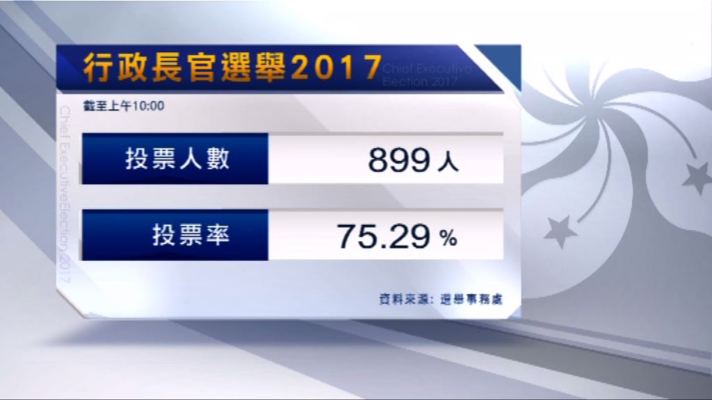 【Now新聞台】行政長官選舉已開始投票,截止十時,1194名選委中已有899人已投票,投票率達75.29%。