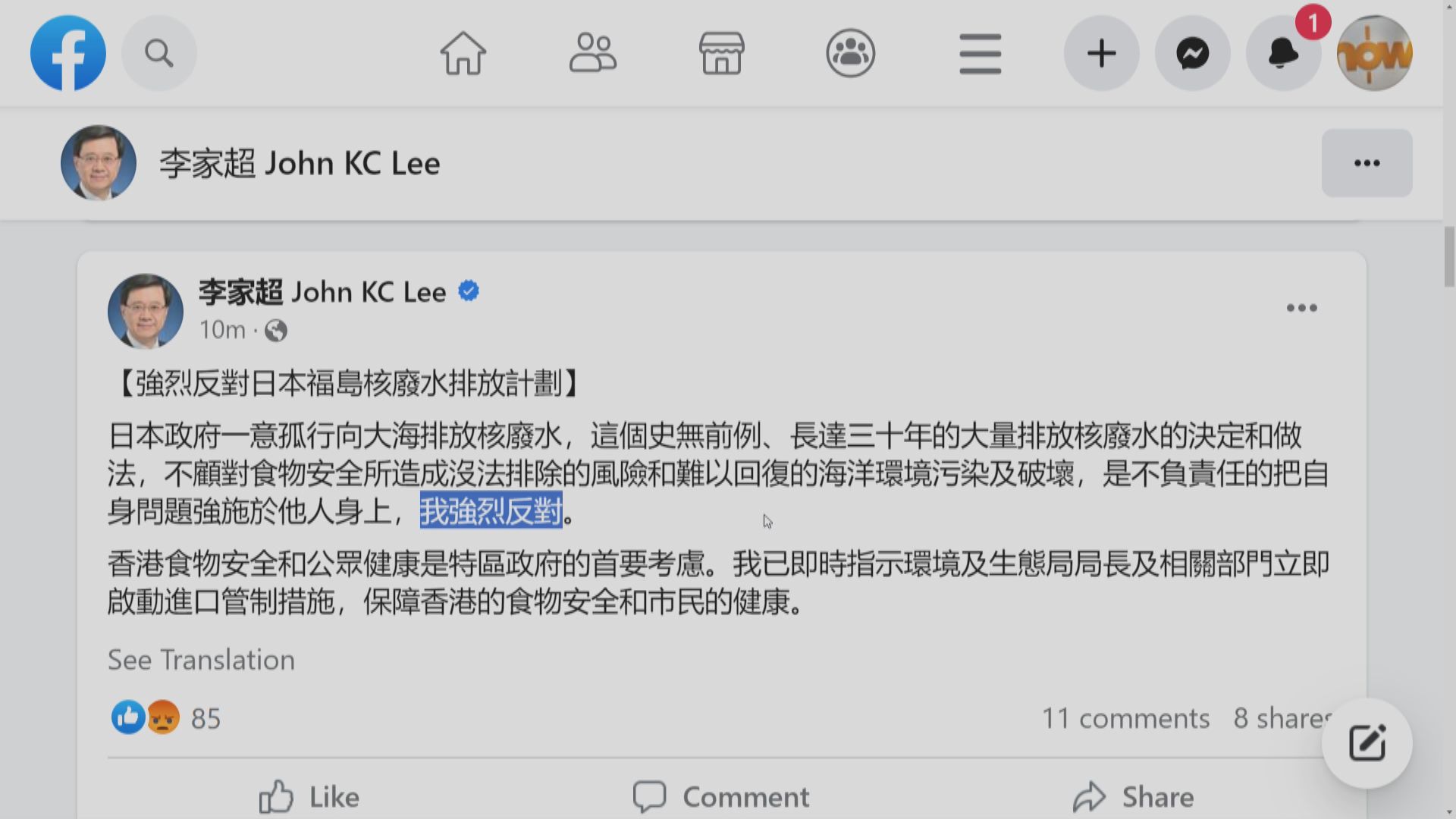 【Now新聞台】行政長官李家超強烈反對日本排放核廢水的決定,已即時指示環境及生態局等立即啟動進口管制措施。