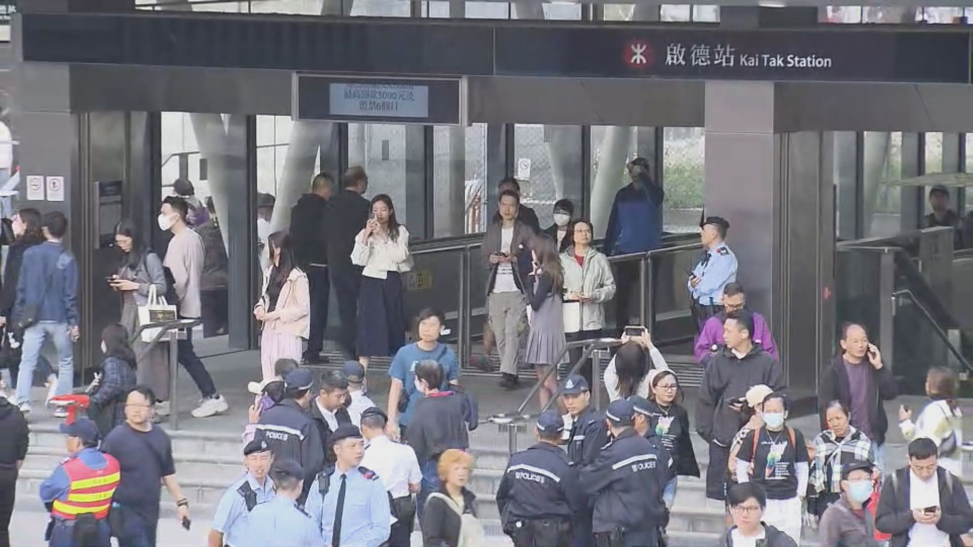 【Now新聞台】啟德體育園今日進行演練,本台記者車軒珩傍晚約6時在啟德站附近報道,指演練仍未結束,但在下午5時45分已有參與演練的人士陸續離開體藝館到啟德站,之後各人會折返兩個會場。而現場所見,啟德站人流開始多,警方在現場實施人潮管制,讓離場的觀眾分批進入啟德站,亦有港鐵職員在場協助疏導人流。