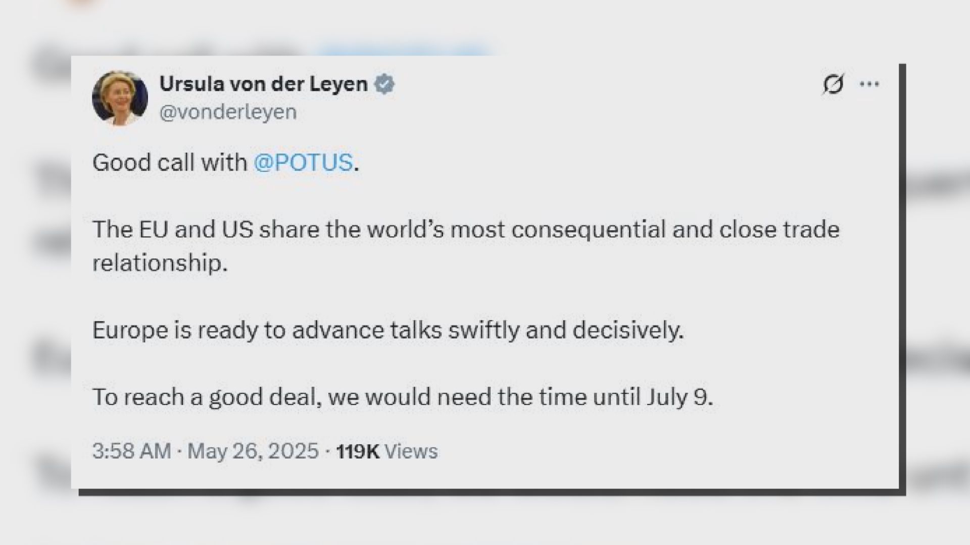 【Now新聞台】美國總統特朗普表示,與歐盟委員會主席馮德萊恩通話後,決定將下月1日起對歐盟進口貨物徵收五成關稅的措施,押後至7月9日。馮德萊恩表示,歐盟已準備好盡快與美國展開貿易談判。