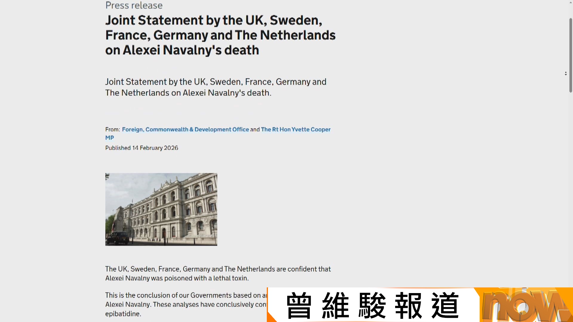 【Now新聞台】五個歐洲國家指,兩年前死於獄中的俄羅斯反對派領袖納瓦爾尼死因是被下毒,而非當年俄方公布的患病導致心律不正致死。